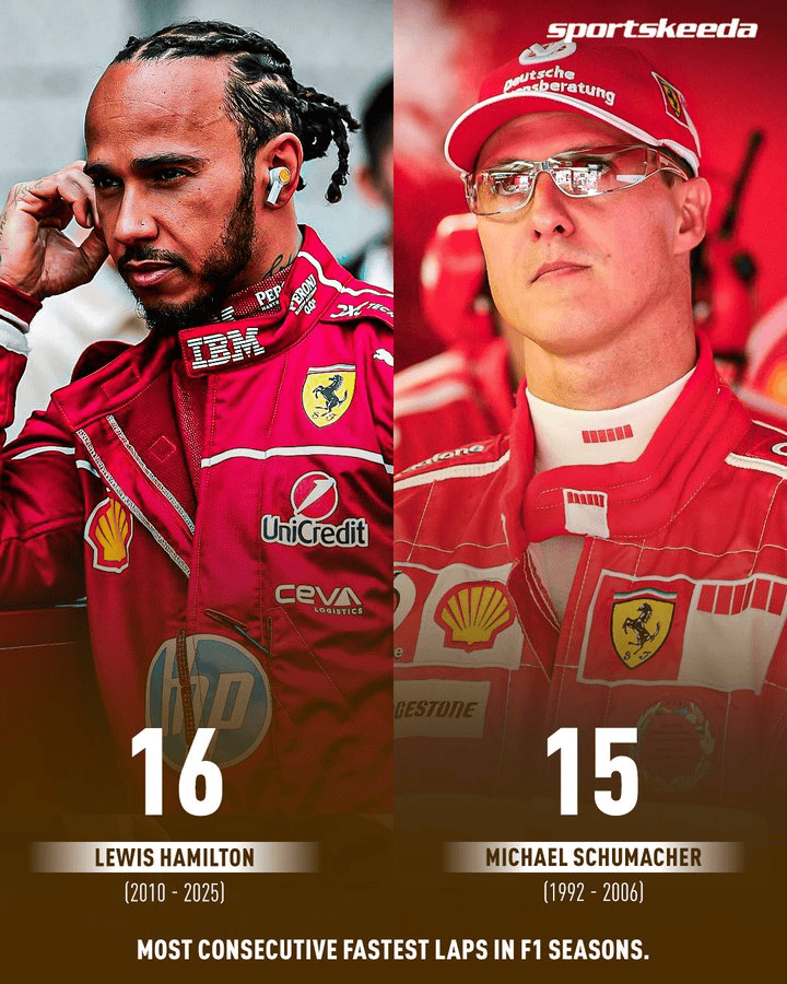 汉密尔顿连续16个赛季(2010-2025年)取得最快圈速的纪录超越了“车王”迈克尔-舒马赫的15个赛季的纪录(1992-2006年),他在这一榜单上独占鳌头。